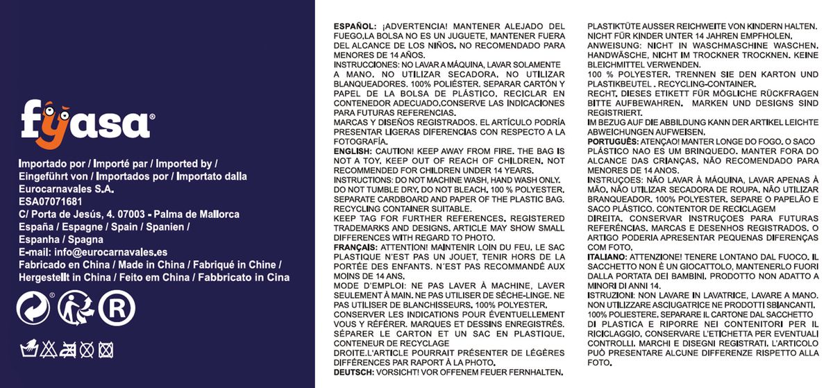 Todos nuestros Disfraces y Accesorios cumplen con las rigurosas medidas de seguridad obligatorias por la Unión Europea CE compre en CUALQUIER DISFRAZ y tenga una experiencia positiva, deje sus comentarios y/o preguntas, así ayudaran a otros clientes y crecerá nuestra comunidad, que la diversión no pare.