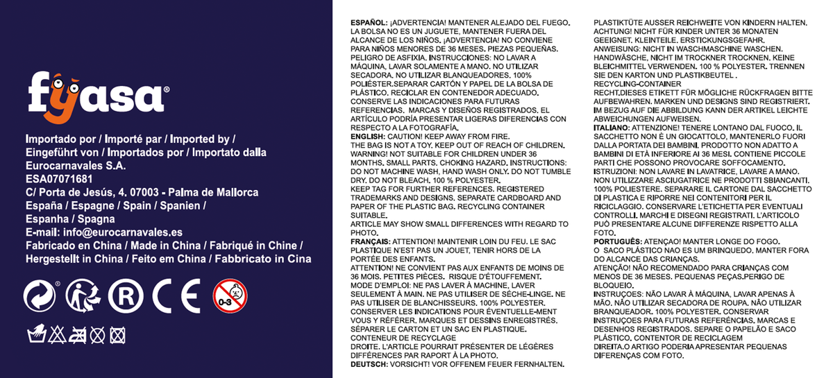 Todos nuestros Disfraces y Accesorios cumplen con las rigurosas medidas de seguridad obligatorias por la Unión Europea CE compre en CUALQUIER DISFRAZ y tenga una experiencia positiva, deje sus comentarios y/o preguntas, así ayudaran a otros clientes y crecerá nuestra comunidad, que la diversión no pare.