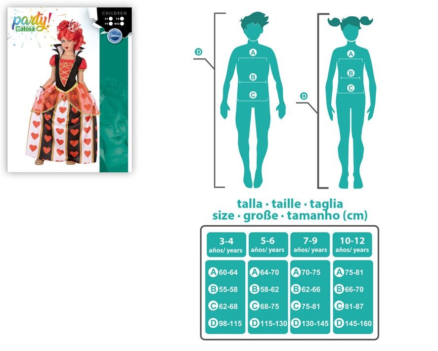 Dies ist ein fantastisches Atosa-Kostüm für Kinder. Dieses Queen Hearts 3-4 Kostüm ist für 3-4 Jahre konzipiert. Es ist eine perfekte Größe für ein Kind von 98 bis 115 Zentimetern. Das Kostüm besteht aus 2 Teilen. Der Inhalt ist: ein Kleid der Königin der Herzen und eine Krone.